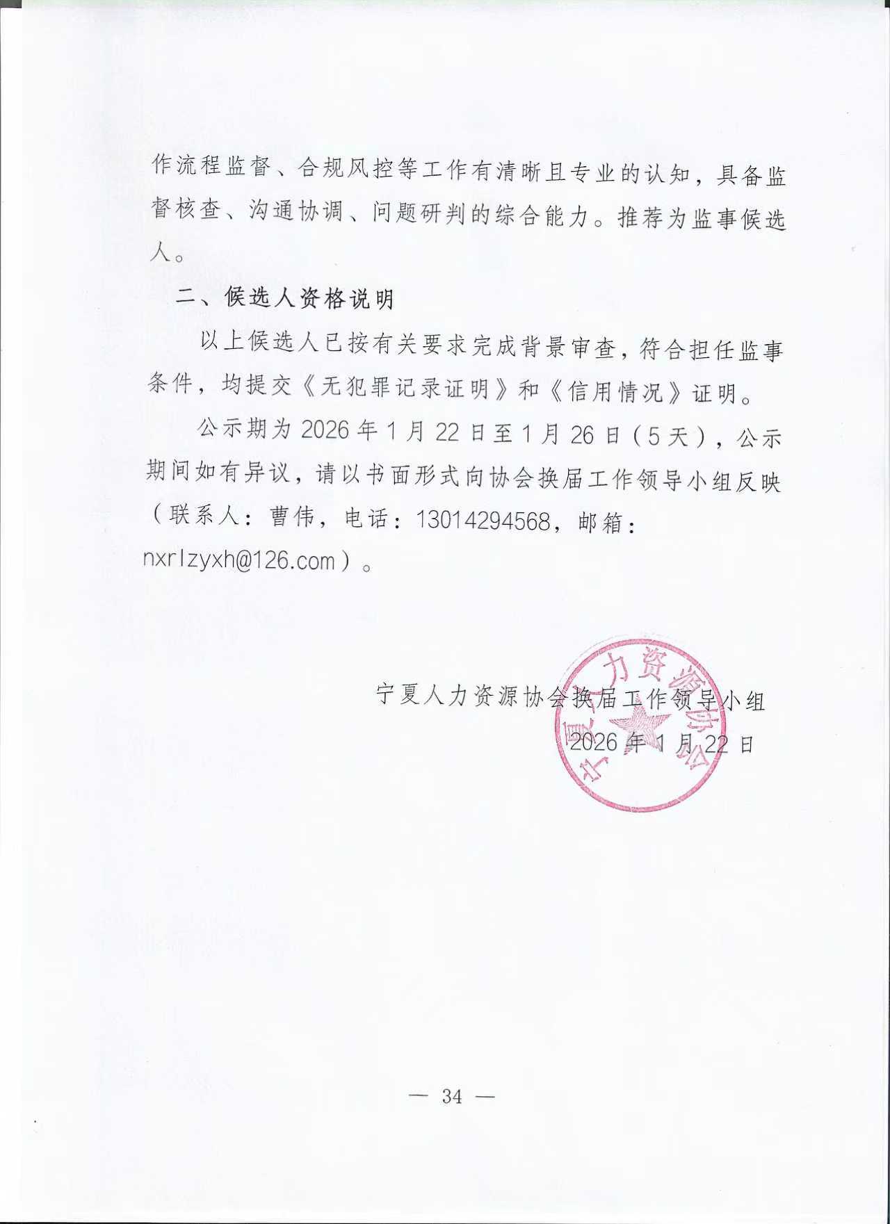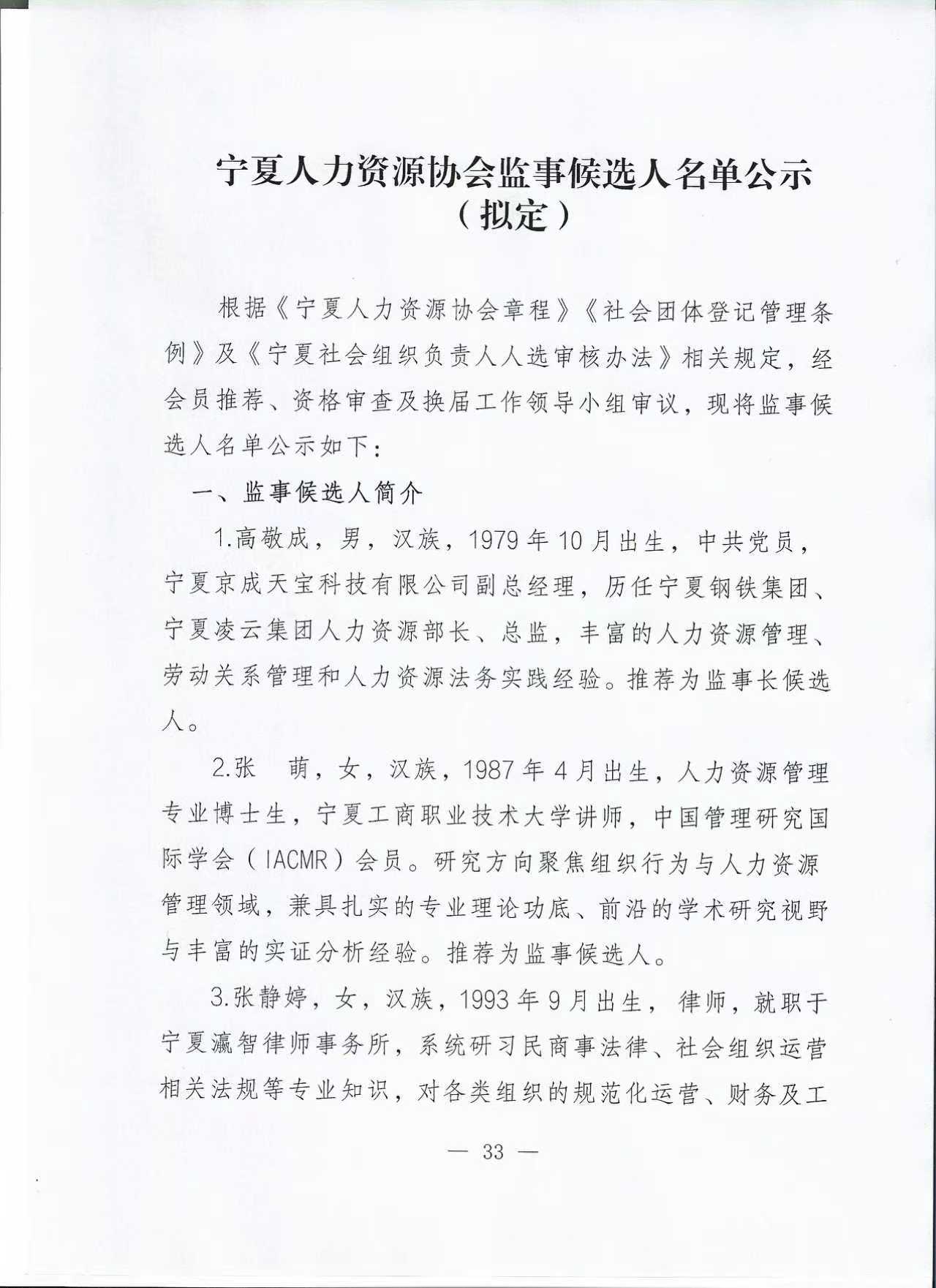 宁夏人力资源协会监事候选人名单公示(拟定)