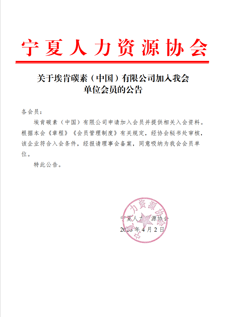 关于埃肯碳素(中国)有限公司加入我会 单位会员的公告