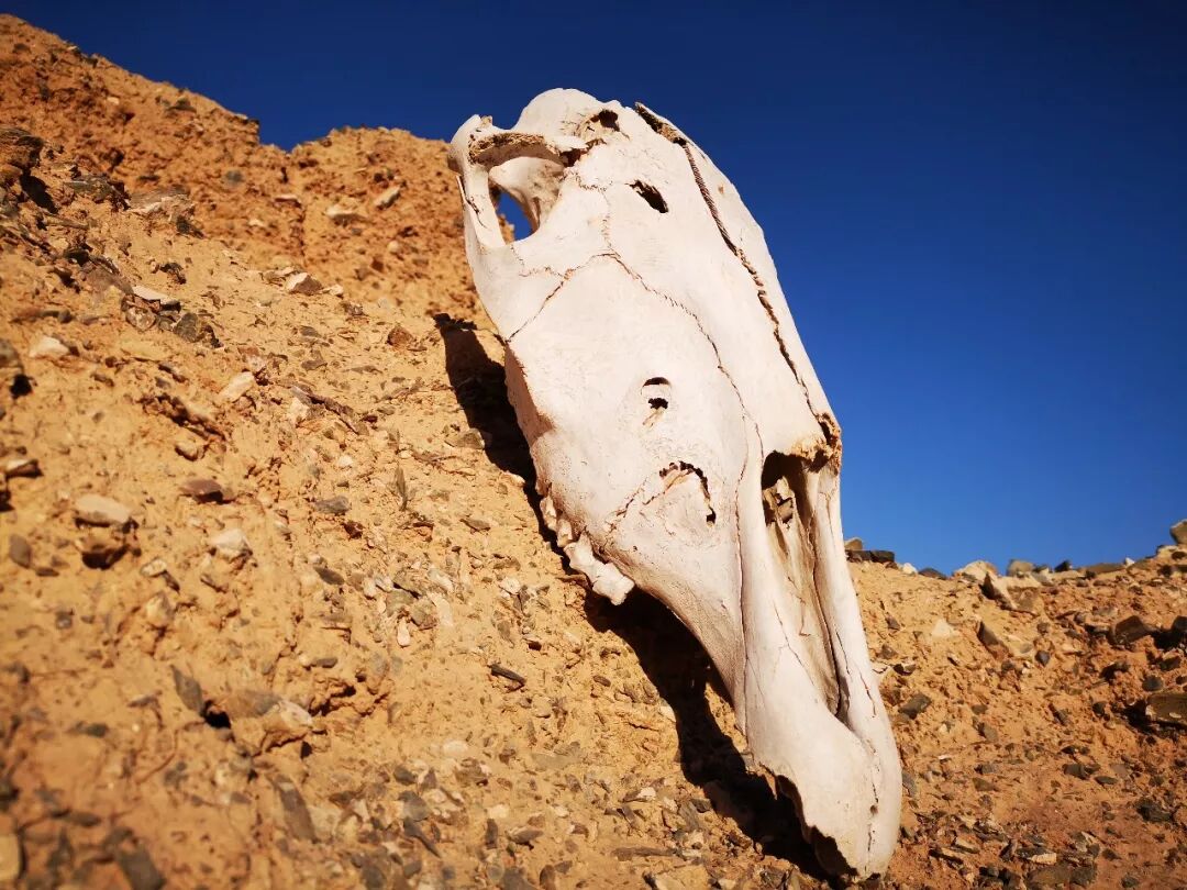 发现一处马头骸骨,在厚重荒芜的城墙映衬下,显得悲凉沧桑。