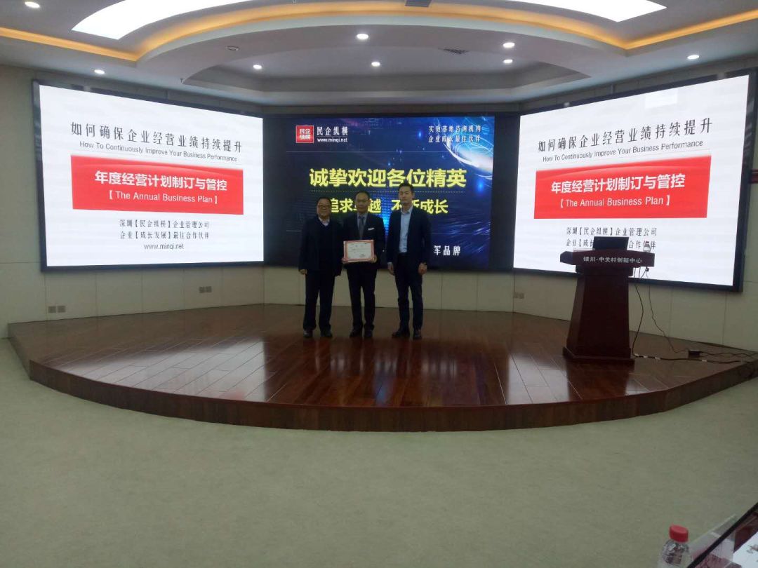 为帮助企业更好的制定与落实年度经营计划,2019年4月13日,由宁夏人力资源协会主办 ,深圳市民企纵横管理咨询公司、银川中关村创新中心协办的《企业年度经营计划制定与管控》公益公开课在银川市中关村创新中心成功举办。来自宝丰集团、建发集团、广电传媒集团、泰瑞制药、铁发人力、源众人才、共享人力、晓鸣农牧等协会会员单位和特邀企业的70多位中高层管理人员参加培训。培训由协会秘书长曹伟主持,协会常务副会长、宝丰集团副总裁贺浒浜出席活动并代表协会为赵国强老师颁发我会专家委员会管理专家聘书。
