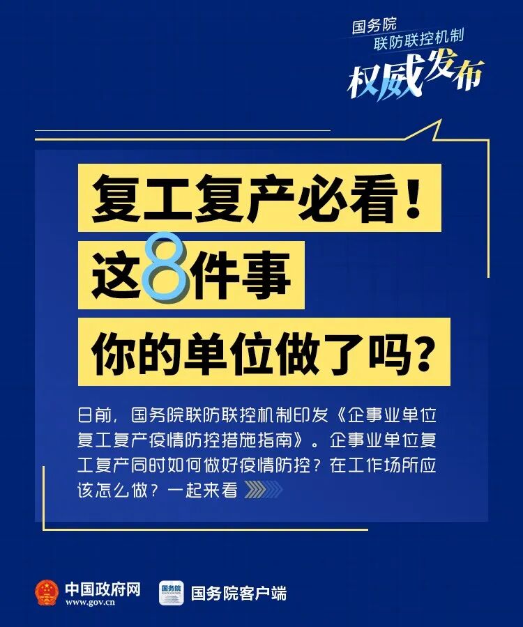 国务院应对新型冠状病毒感染肺炎疫情联防联控机制关于印发企事业单位复工复产疫情防控措施指南的通知