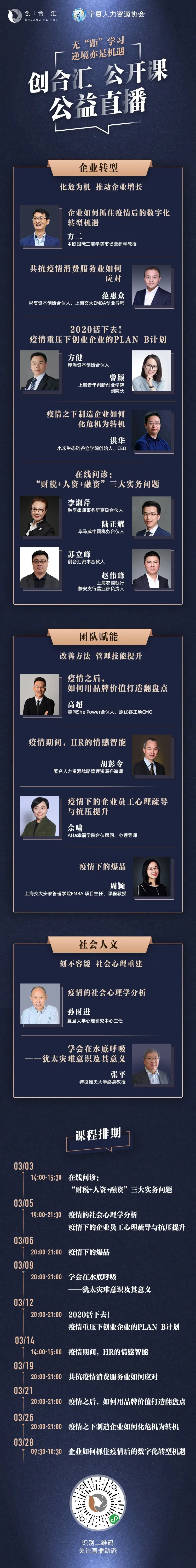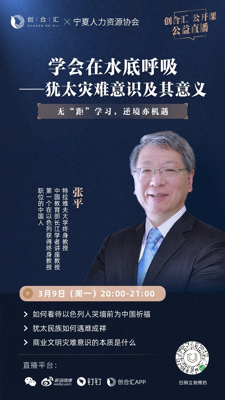 为了帮助广大会员单位和我区中小企业共渡难关,共同打赢这场抗疫攻坚战。宁夏人力资源协会 携手 创合汇 结合当前企业实际需求,联名打造系列公开课公益直播,力邀数位知名专家、学者、投资人进行相关热点系列公益直播授课。本期力邀以色列-特拉维夫大学终身教授张平先生,为您带来《学会在水底呼吸-犹太灾难意识及意义》。无“距”学习、逆境亦是机遇!3月9日20:00准时开播,欢迎扫码预约学习。
