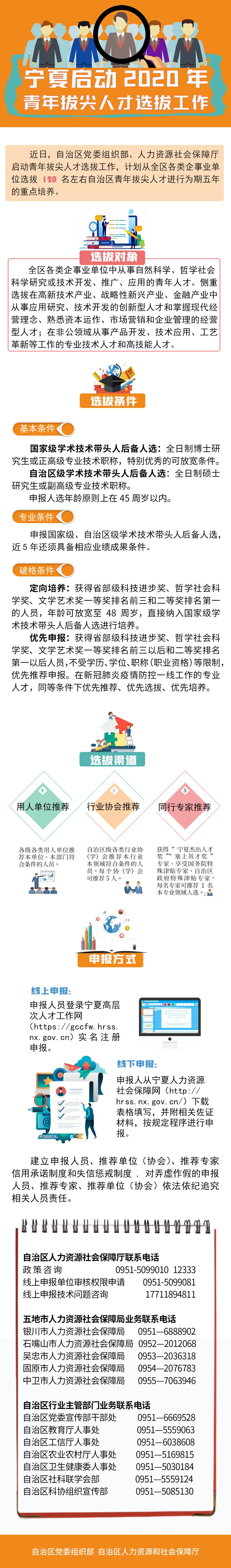 为进一步推进人才发展体制机制改革、拓宽人才发现渠道,加快培养和储备一批数量充足、结构合理、素质优良的高层次后备人才队伍,自治区党委组织部、人力资源社会保障厅于近日启动2020年自治区青年拔尖人才选拔工作,计划今年从全区各类企事业单位选拔120名左右青年拔尖人才进行重点培养。与以往不同的是,今年“青拔”选拔工作呈现出四点变化。 一是更加突出业绩导向。对业绩和贡献特别突出的青年人才将进行定向培养,即对获得省部级科技进步奖、哲学社会科学奖、文学艺术奖一等奖排名前三和二等奖排名第一的人员,年龄可放宽至48周岁,经自愿申报、单位初审、组织考察后,直接纳入国家级学术技术带头人后备人选范围。对业绩和贡献比较突出的青年人才可优先申报,即对获得省部级科技进步奖、哲学社会科学奖、文学艺术奖一等奖排名前三以后和二等奖排名第一以后人员,不受学历、学位、职称(职业资格)等限制,可优先推荐申报国家级和自治区级学术技术带头人后备人选。同时,在新冠肺炎疫情防控一线工作的专业人才,同等条件下优先推荐。 二是更加突出行业作用。符合条件的青年人才可选择用人单位推荐、行业协(学)会推荐、同行专家推荐三种渠道中的任何一种进行申报。其中:行业协会推荐主要由自治区级各类行业协(学)会发挥联系、协调、服务人才的独特作用,推荐本行业本领域符合条件的人员,每个协(学)会可推荐5人,从事专业属社会科学的报送自治区社科联、属自然科学的报送自治区科协;同行专家推荐主要由获得“宁夏杰出人才奖”“塞上英才奖”专家、享受国务院特殊津贴专家、自治区政府特殊津贴专家发挥人才培养的“传帮带”作用,每名专家可推荐1名本专业领域人选。 三是更加突出信息化手段。今年青年拔尖人才推荐选拔通过线上线下并行方式申报。其中,线上申报时,由申报人员登录宁夏高层次人才工作网(https://gccfw.hrss.nx.gov.cn),实名注册并进入“人才工程评选—青年拔尖人才”栏目,按要求填写信息,并拍照上传相关佐证材料。线上线下填报资料、审核结果须保持一致。 四是更加突出诚信要求。自治区将建立申报人员、推荐单位(协会)、推荐专家信用承诺制度和失信惩戒制度。申报人员对所填报内容真实性负责并在申报时作信用承诺,推荐单位(协会)和推荐专家对被推荐人业绩和品德负审核把关责任。对弄虚作假的申报人员一经查实五年内不得申报自治区所有人才选拔工程项目;对弄虚作假的推荐专家将记入诚信档案,取消相关荣誉资格;对把关不严的推荐单位(协会)五年内停止人才项目、资金申报,在人才工作年度效能目标考核中视情节给予单位扣分,对行业协会同时通报注册登记部门予以处理。对情节严重的推荐单位、推荐专家、申报人员将在一定范围通报批评,并依法依纪追究相关人员责任。(专技处)