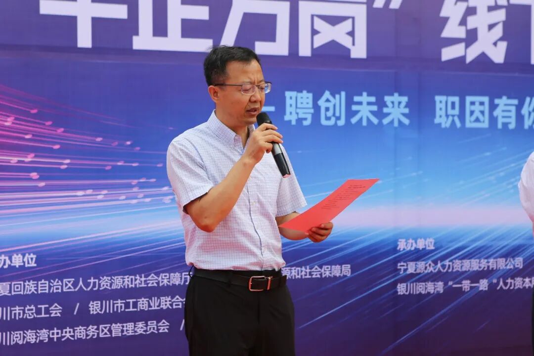 ★ PIC.01 出席启动仪式领导合影 6月25日上午,“人才金街稳岗促就业大型公益系列活动”在银川阅海湾一带一路人力资本服务产业园成功举行。自治区人社厅人力资源流动管理处处长赵启斌、银川市就业与创业服务中心主任龙军、银川市工商业联合会党组成员王文东、银川市总工会副主席黄建华、银川市总工会主任宋炜、银川阅海湾中央商务区管委会主任刘学礼、宁夏人力资源协会秘书长曹伟及宁夏源众人力资源服务有限公司董事长张斐松出席启动仪式。 PIC.02 阅海湾商务区刘学礼主任主持仪式 ★ PIC.03 银川市就业与创业服务中心主任龙军致辞 银川市就业与创业服务中心主任龙军致辞时表示:“高校毕业生就业关系千万家庭,关乎社会和谐稳定,各企业及各人力资源服务机构要全面贯彻落实中央和自治区关于促就业保就业工作要求,不断创新招聘求职工作方式、为重点就业群体搭建就业服务平台,为企业储备输送优质人才,合力解决就业限制、就业难等问题。” ★ PIC.04 自治区人社厅人力资源流动管理处 赵启斌处长宣布活动启动 自治区人社厅人力资源流动管理处处长赵启斌宣布活动正式启动 ★ ★ ★ ★ ★ 本次稳岗促就业系列公益活动共分为四个环节,活动现场设置线下招聘会、线上直播带“岗”、政策解读;校地企就业合作对接沙龙,为求职人才和用人企业提供全方位服务。 “短视频求职招聘大赛”持续报名中 点击上方“蓝字”,进入报名链接★